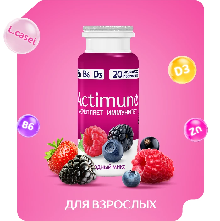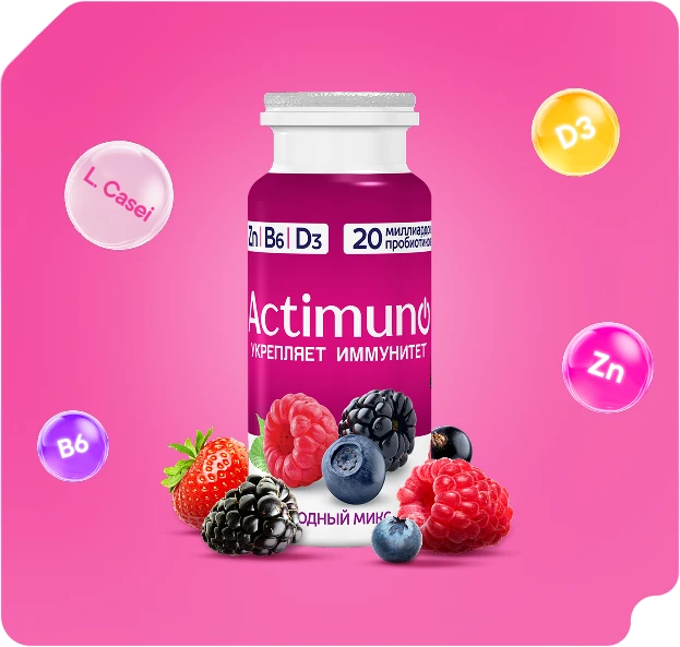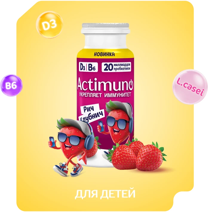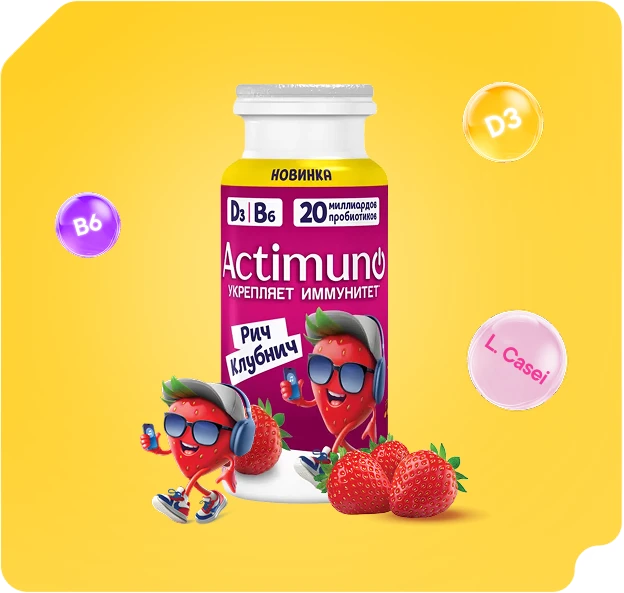 Это кисломолочный, пробиотический продукт. Сквашенный традиционной йогуртовой закваской состоящей из Lactobacillus bulgaricus и Streptococcus thermophilus, а также обогащенный пробиотическими лактобактериями L. casei Actimunis. Количество данных пробиотических лактобактерий в продукте не менее 108 КОЕ/г, что является достаточным для оказания положительного влияния Actimuno на здоровье человека.